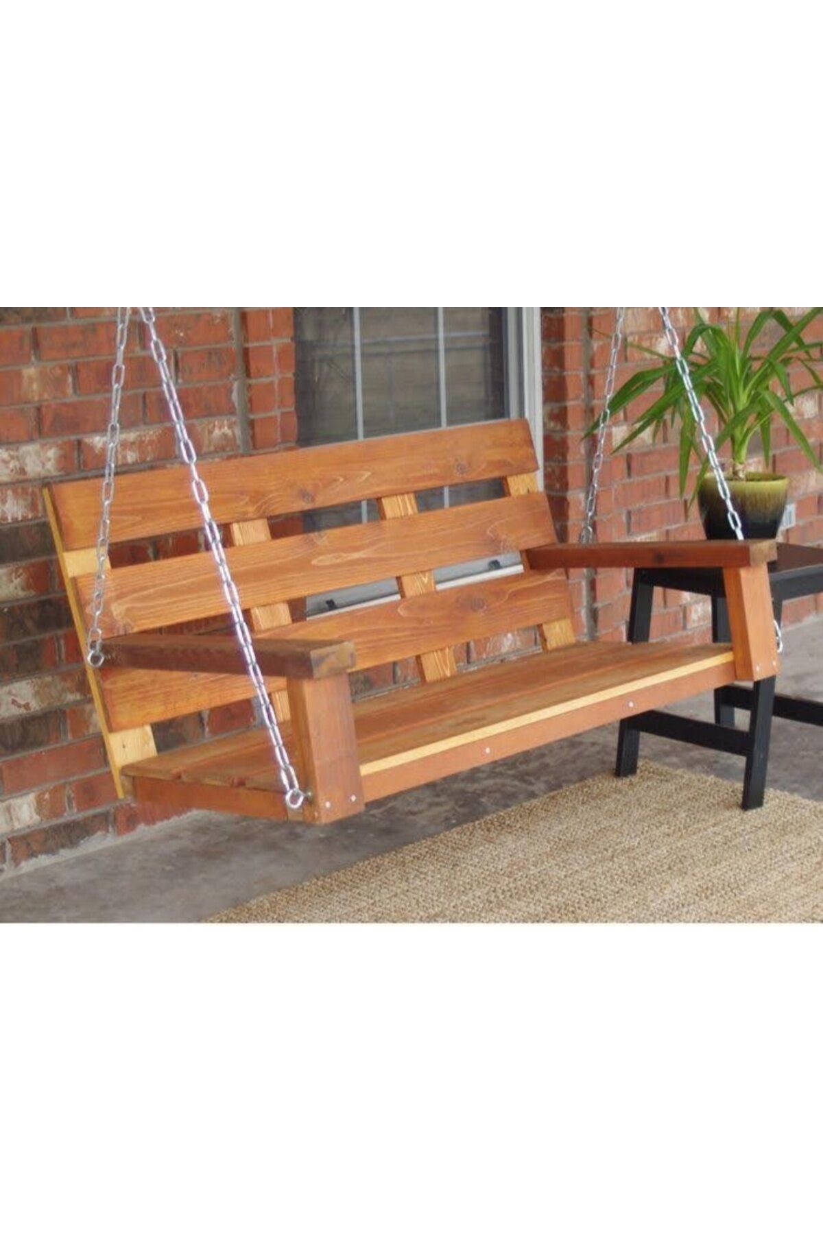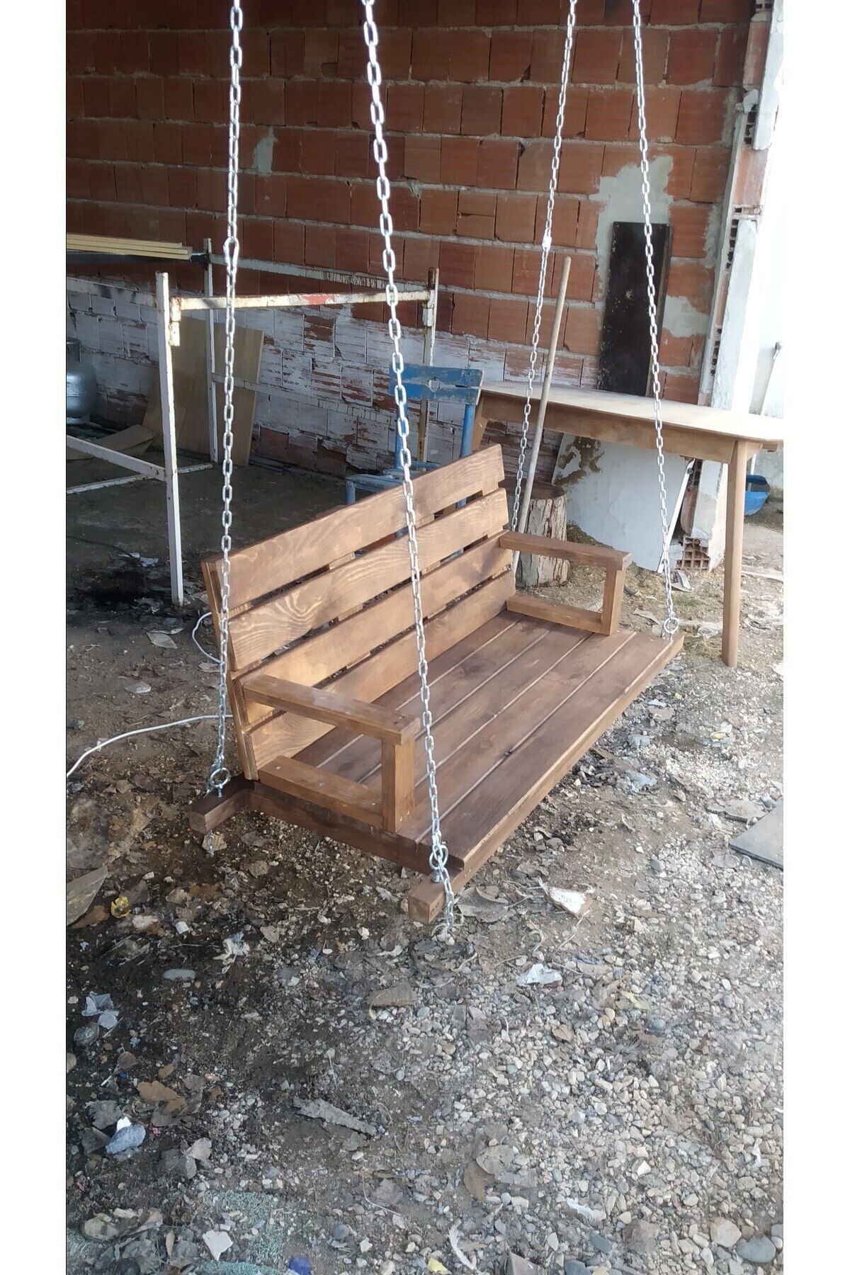 Ürünümüz birinci kalite ithal çam ağacından yapılmaktadır.; Koruyucu boya uygulanmaktadır yağmura suya dayanıklıdır.; Zincir ve asma aparatları dahildir.; 200 kg taşıma kapasitesine sahiptir.; 120×45×45 ölçülerindedir.; Oturma alanı 100 cm.; dir