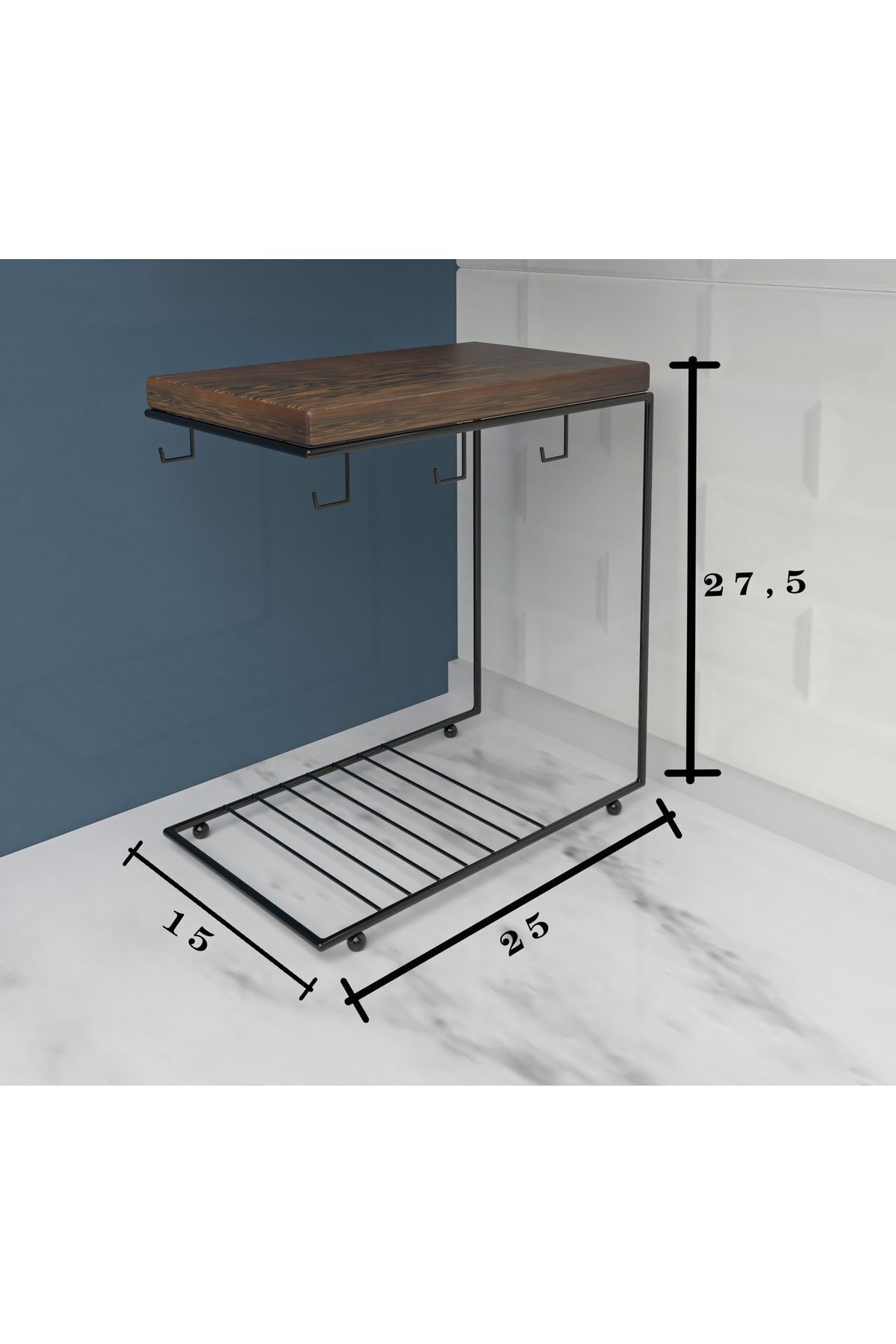 6 ADET KAHVE FİNCANI VE TABAĞI VEYA İSTENİRSE NESCAFE FİNCANI VE TABAĞI KONULACAK KAPASİTEDEDİR. ; ÜST KISMI VERNİKLİ DOĞAL MASİF AĞAÇTIR. SUYA NEME KARŞI DAYANAKLIDIR ŞİŞME KABARMA YAPMAZ. ; ÜRÜN ÖZELLİKLERİ ÜRÜN 6 MM TELDEN İMAL EDİLMİŞTİR. ; ELEKTROSTATİK TOZ BOYA İLE BOYANMIŞ FIRINLANIŞTIR BOYA ATMASI YAPMAZ 6 ADET ASKISI MEVCUTTUR ; ÖLÇÜLERİ YÜKSEKLİK :27 CM ; DERİNLİK:15 CM ; ALT TABAN UZUNLUK:25 CM ; ÜST UZUNLUK:22 CM ;