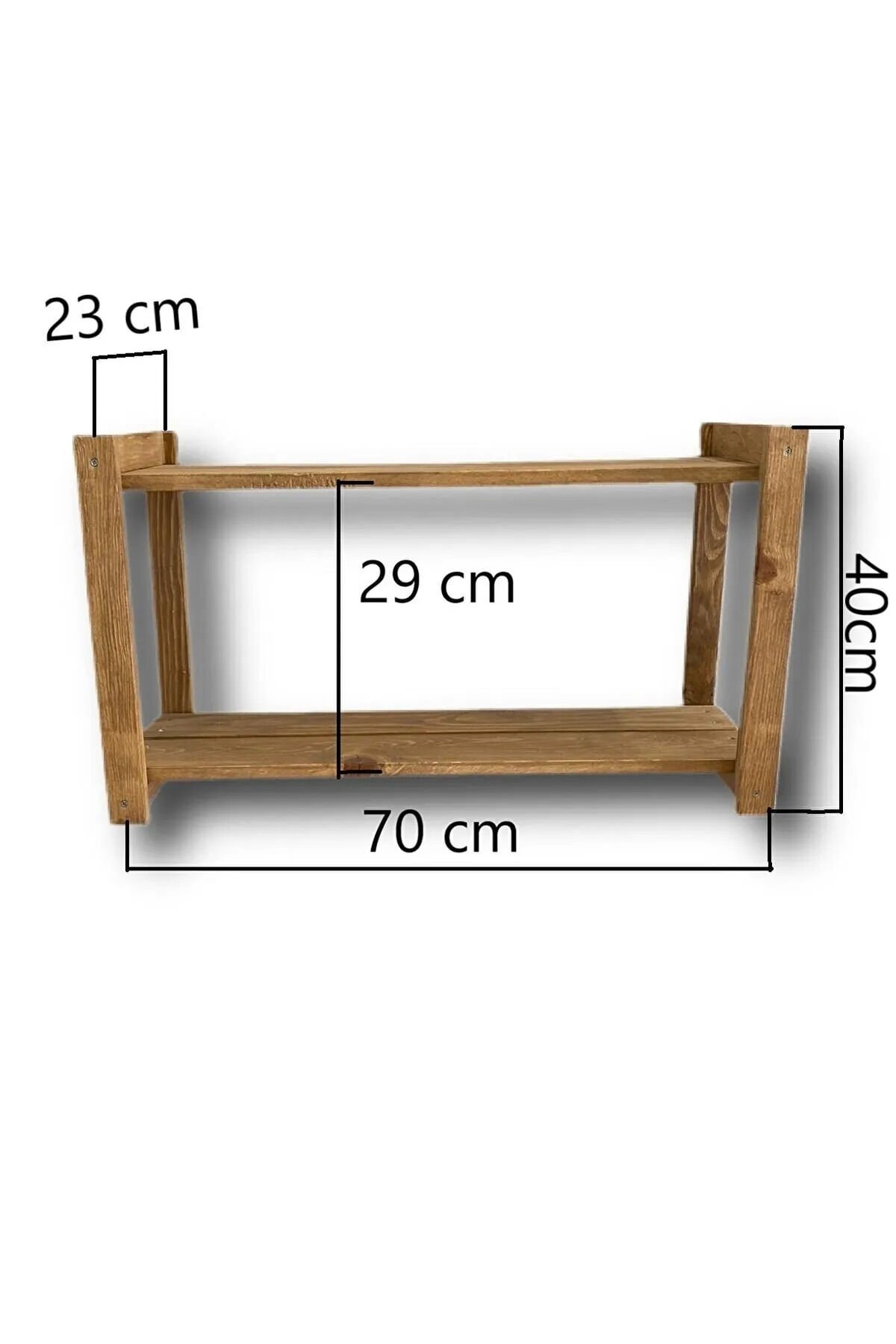 Renk: Ceviz ; Materyal: Ahşap ; Genişlik: 70 cm ; Yükseklik: 40 cm ; Derinlik:26 cm ; Raf Aralıkları: 29 cm ; Fotoğraftaki aksesuarlar fiyata dahil değildir. ; Ürünlerimiz el yapımı olup, doğal ahşaptan üretilmektedir. ; Doğal dokusunun bozulmamasına özen gösterilmiştir. ; 'Doğal' ağaç ürünleri, ağaç görünümüne sahip, sentetik malzemeden üretilmiş sunta lam veya MDF malzemelerle karıştırılmamalıdır. ; Doğal ahşap ürünlerin tamamı geri dönüştürülebilir ürünlerdir. ; Bu sebeple çevreye zararsız ürünlerdir. ; Doğal ahşap ürünlerin diğer türlere göre daha az bakım gerektirdiği bilinir. ; Hem dayanıklı bir yapıya sahip hem de diğer malzemelere göre vida tutma özelliği oldukça fazladır. ; %100 çam ağacından, tamamen el işçiliği ile üretilmiş doğal bir üründür. ; Gönderilen ürünle görsel arasında RENK - DESEN ve BUDAK farklılıkları olabilir. ; Üründe kesim kaynaklı 1-2 mm ölçü farklılıkları gözlenebilmektedir. ; Ürün 1. sınıf kalitede doğal çamdan üretilmiştir. ; Ürünlerimizin hiçbirinde zararlı madde kullanılmamaktadır. ; Kolay kurulabilen bir üründür. ;